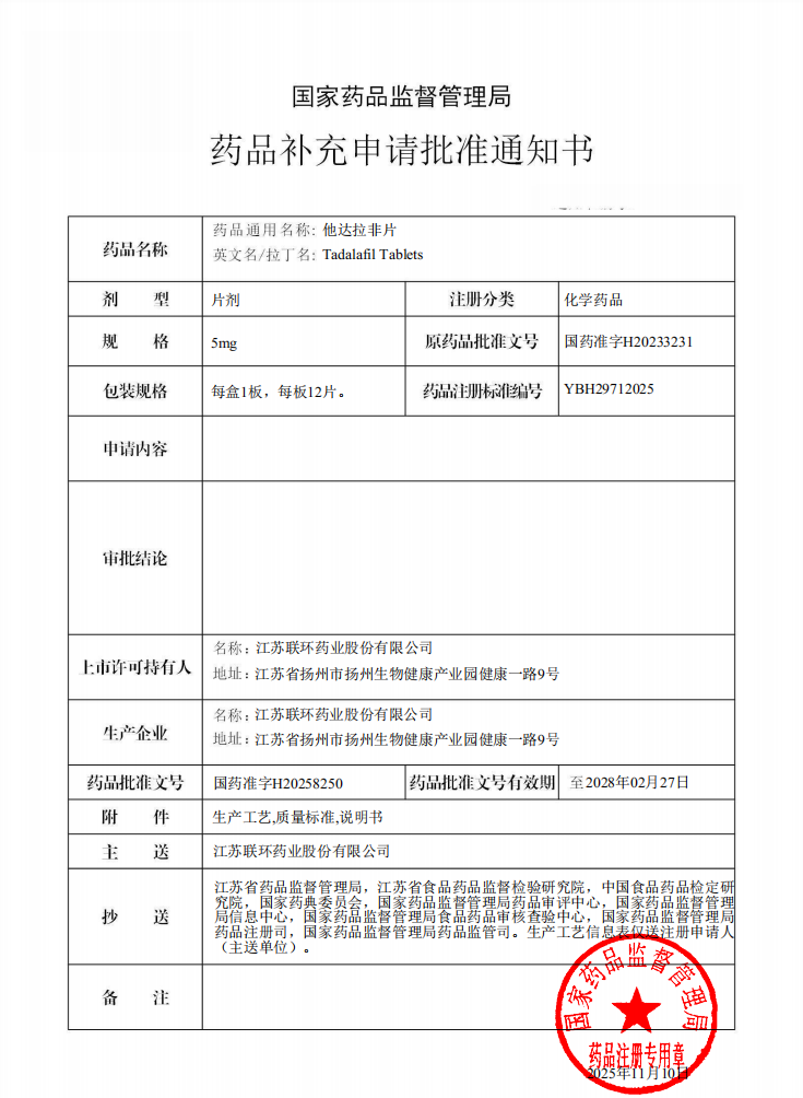 近日,從國家藥品監(jiān)督管理局傳來喜訊,聯(lián)環(huán)股份他達拉非片(2.5mg、5mg)獲得藥品補充申請批件。隨著2.5mg和5mg規(guī)格的獲批,公司在不到3年時間內成功完成他達拉非片所有主流規(guī)格(2.5mg、5mg、10mg、20mg)的上市布局。